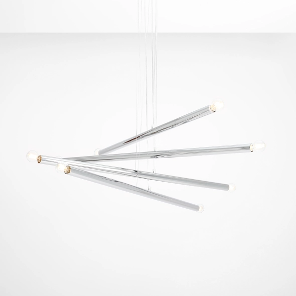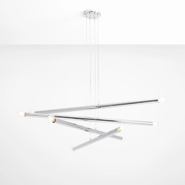 Nowoczesna lampa wisząca Tubo 8 Chrome to cztery metrowe, luźno zawieszone w różnych kierunkach tuby, zakończone źródłem światła E14. Lampa o niebanalnej estetyce i starannym, chromowym wykończeniu. To rozwiązanie dla koneserów dobrego designu i wnętrz w stylu glamour.