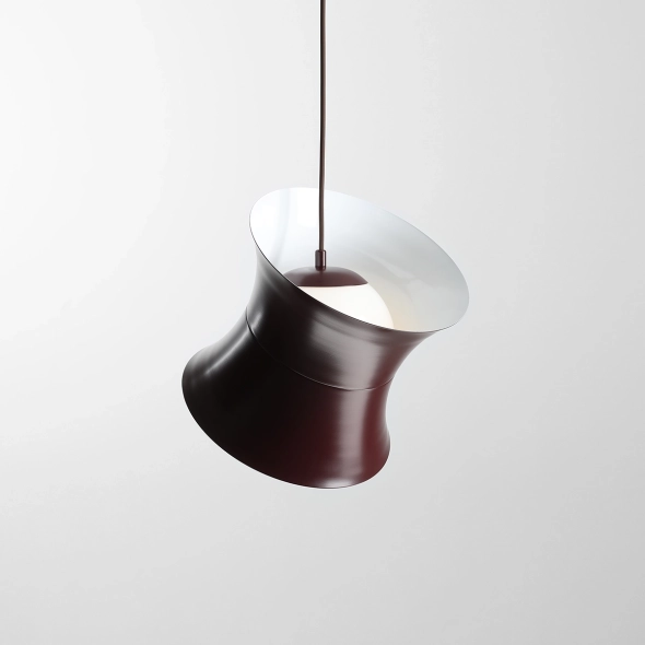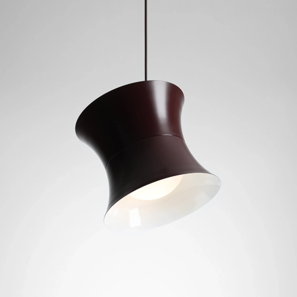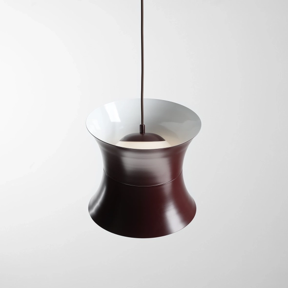 Il paralume in metallo da 25 cm di diametro, rifinito in un intenso bordeaux, nasconde un paralume bianco lucido da 16 cm di diametro che diffonde delicatamente la luce, conferendole un aspetto caldo e piacevole. La forma geometrica e le linee pulite evocano l'estetica degli anni '60 e '70, pur mantenendo un carattere senza tempo.