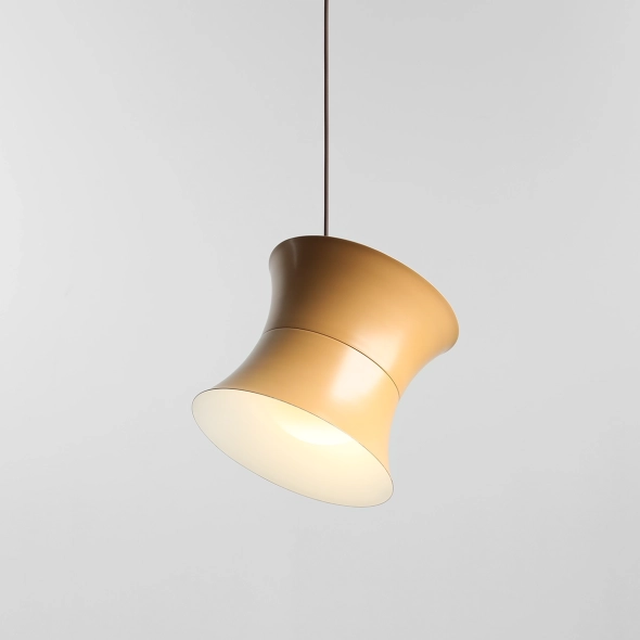 Metalowy klosz o średnicy 25 cm w kolorze ochry połączony jest z białym, połyskującym kloszem wewnętrznym o średnicy 16 cm, który delikatnie rozprasza światło i buduje przytulną atmosferę. Prosta, geometryczna forma sprawia, że lampa pozostaje ponadczasowa.