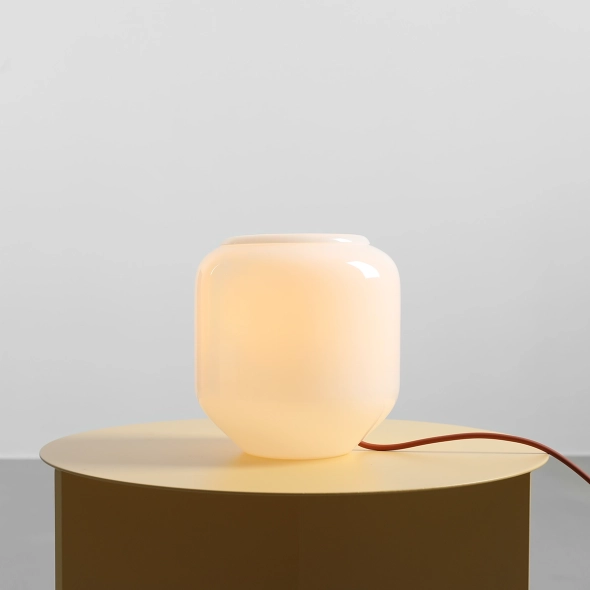 FLASK TABLE S TERRA (proj. Mikołaj Nicer / Nicer Design) to mała lampa biurkowa z opalowego szkła, zaprojektowana w duchu prostoty i czystej formy. Klosz z mlecznobiałego szkła rozprasza światło miękko, a po włączeniu staje się optycznie cieplejszy, budując kameralny nastrój. Szklany „talerzyk” od góry ogranicza olśnienie i porządkuje światło. Ceglany kabel z włącznikiem (RAL 8004) wnosi ziemisty, naturalny akcent, który dobrze łączy się z drewnem, terakotą i tkaninami o ciepłej fakturze. Średnica 18 cm sprawia, że lampa pasuje nawet do mniejszych blatów i półek. W zestawie wymienne źródło światła E14.