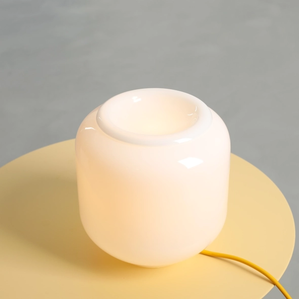 FLASK TABLE S MIMOSA (proj. Mikołaj Nicer / Nicer Design) to mała, minimalistyczna lampa biurkowa, w której miękkie światło opalowego szkła spotyka się z radosnym detalem koloru. Mlecznobiały klosz rozprasza światło przyjemnie i równomiernie, a po włączeniu zyskuje cieplejszy odcień. Górny szklany „talerzyk” osłania źródło światła, zmniejszając efekt rażenia. Energetyczny żółty kabel z włącznikiem (RAL 1006) działa niczym mały „przycisk optymizmu” we wnętrzu - bez przesady, za to z charakterem. Ø18 cm sprawia, że lampa świetnie pasuje na biurko, komodę lub stolik pomocniczy. W zestawie znajduje się wymienne źródło światła E14.