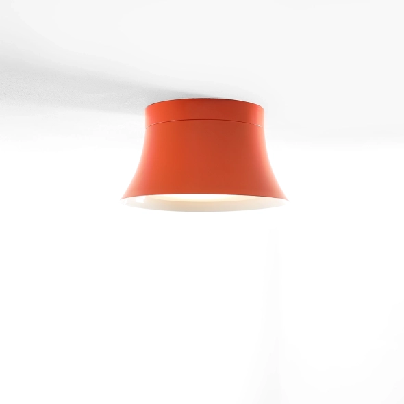 Kibo Flare S to kompaktowy plafon, który wchodzi do wnętrza jak odważny detal projektowy: krótka, solidna forma i intensywny pomarańcz Flare. Szeroka bryła ma w sobie „masę” i architektoniczną pewność, a jednocześnie pozostaje minimalistyczna i czysta w odbiorze. Klosz otwiera się ku dołowi, dzięki czemu światło jest miękkie, uporządkowane i kierunkowe - przyjemne na co dzień, bez ostrości.