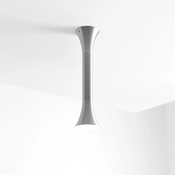 Wydłużona, smukła sylwetka (wysokość 42 cm) sprawia, że model L świetnie prezentuje się w większych przestrzeniach: w salonie, holu czy nad dłuższym ciągiem komunikacyjnym. To plafon, który buduje kompozycję sufitu jak detal architektoniczny - mocny, ale nie dominujący.