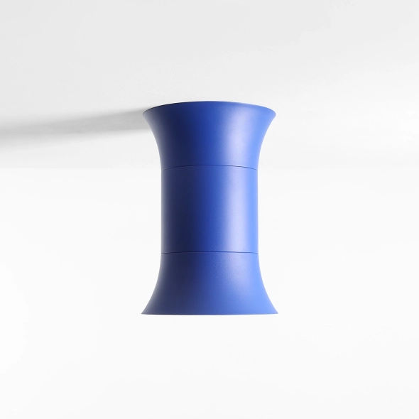 Kibo Cobalt L robi wrażenie od pierwszego spojrzenia: głęboki kobalt i szeroka, zwarta bryła, która wygląda jak dopracowany obiekt użytkowy. To plafon krótki, ale „mocny” wizualnie - kolor ma tu przestrzeń, żeby wybrzmieć, a forma trzyma minimalistyczną dyscyplinę kolekcji. Klosz otwierający się ku dołowi daje miękkie, kontrolowane światło, które buduje klimat bez ostrości.