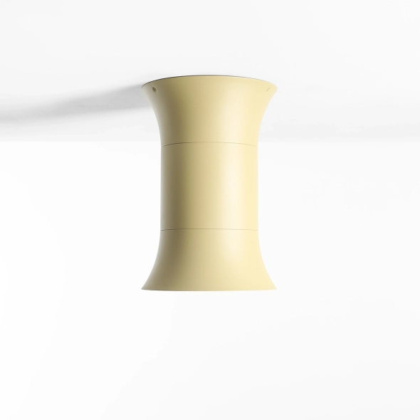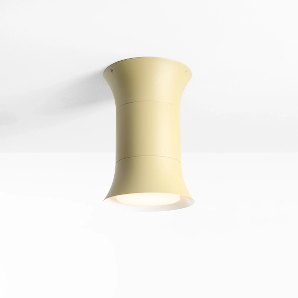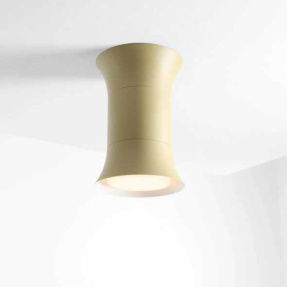 Kibo Pistachio L wprowadza do wnętrza świeżość w nietuzinkowym, dopracowanym wydaniu. Pistacjowy odcień pięknie współgra z szeroką, „grubszą” bryłą i podkreśla retro-futurystyczną geometrię kolekcji. Klosz otwierający się ku dołowi daje miękkie, kierunkowe światło, które ociepla przestrzeń, ale nie robi jej ciężkiej - raczej „ustawia” klimat i porządkuje sufit.