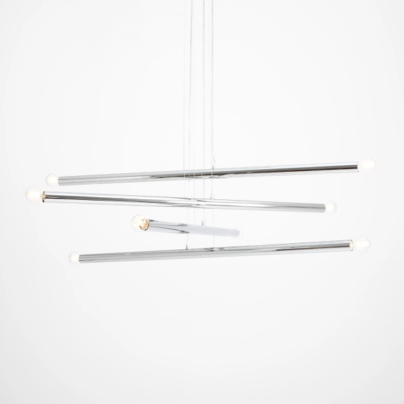 Nowoczesna lampa wisząca Tubo 8 Chrome to cztery metrowe, luźno zawieszone w różnych kierunkach tuby, zakończone źródłem światła E14. Lampa o niebanalnej estetyce i starannym, chromowym wykończeniu. To rozwiązanie dla koneserów dobrego designu i wnętrz w stylu glamour.