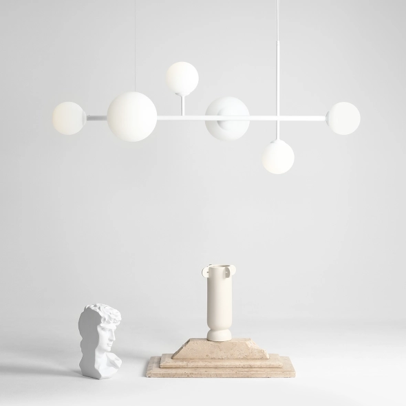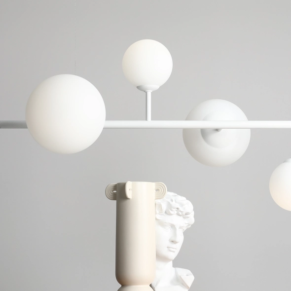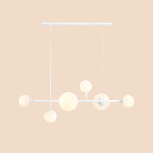 Sześciopunktowa lampa wisząca o nowoczesnym designie. Ten innowacyjny model DIONE 6 to wersja na listwie z centralnie wprowadzonym źródłem światła. Idealna do salonu lub jadalni, szeroka (130 cm), z regulacją wysokości. Lampa posiada dwa kuliste, matowe klosze (o średnicy 20cm) wychodzące z boków oprawy oraz cztery mniejsze (14cm). Dione to idealne rozwiązanie nad duży, gościnny lub konferencyjny stół.