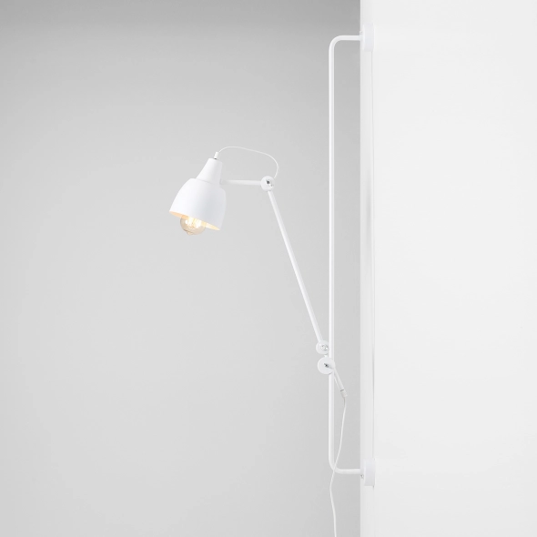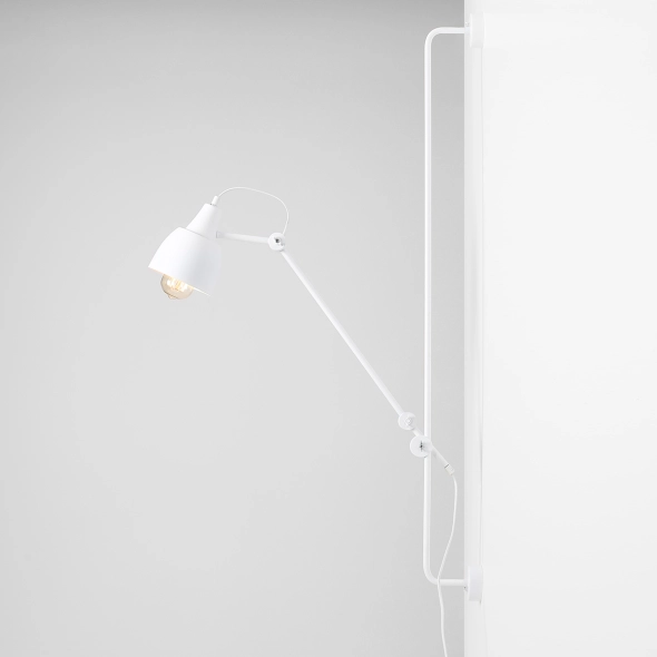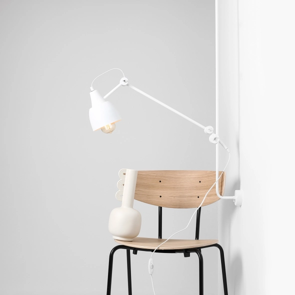 Industrialny kinkiet Dron White wykonany z metalu, rewelacyjnie harmonizuje zarówno z minimalistycznymi, jak i industrialnymi, surowymi wnętrzami. Dużą zaletą lampy jest możliwość ustawienia jej ramienia na dowolnej wysokości oraz różnego nachylenia kąta klosza. Posiada ona długi przewód z włącznikiem, co czyni ją niezależną od miejsca wyprowadzenia źródła światła ze ściany.