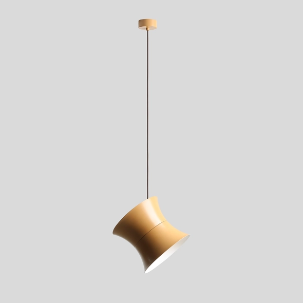 Metalowy klosz o średnicy 25 cm w kolorze ochry połączony jest z białym, połyskującym kloszem wewnętrznym o średnicy 16 cm, który delikatnie rozprasza światło i buduje przytulną atmosferę. Prosta, geometryczna forma sprawia, że lampa pozostaje ponadczasowa.