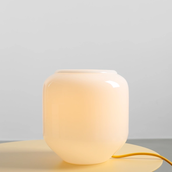 FLASK TABLE S MIMOSA (proj. Mikołaj Nicer / Nicer Design) to mała, minimalistyczna lampa biurkowa, w której miękkie światło opalowego szkła spotyka się z radosnym detalem koloru. Mlecznobiały klosz rozprasza światło przyjemnie i równomiernie, a po włączeniu zyskuje cieplejszy odcień. Górny szklany „talerzyk” osłania źródło światła, zmniejszając efekt rażenia. Energetyczny żółty kabel z włącznikiem (RAL 1006) działa niczym mały „przycisk optymizmu” we wnętrzu - bez przesady, za to z charakterem. Ø18 cm sprawia, że lampa świetnie pasuje na biurko, komodę lub stolik pomocniczy. W zestawie znajduje się wymienne źródło światła E14.