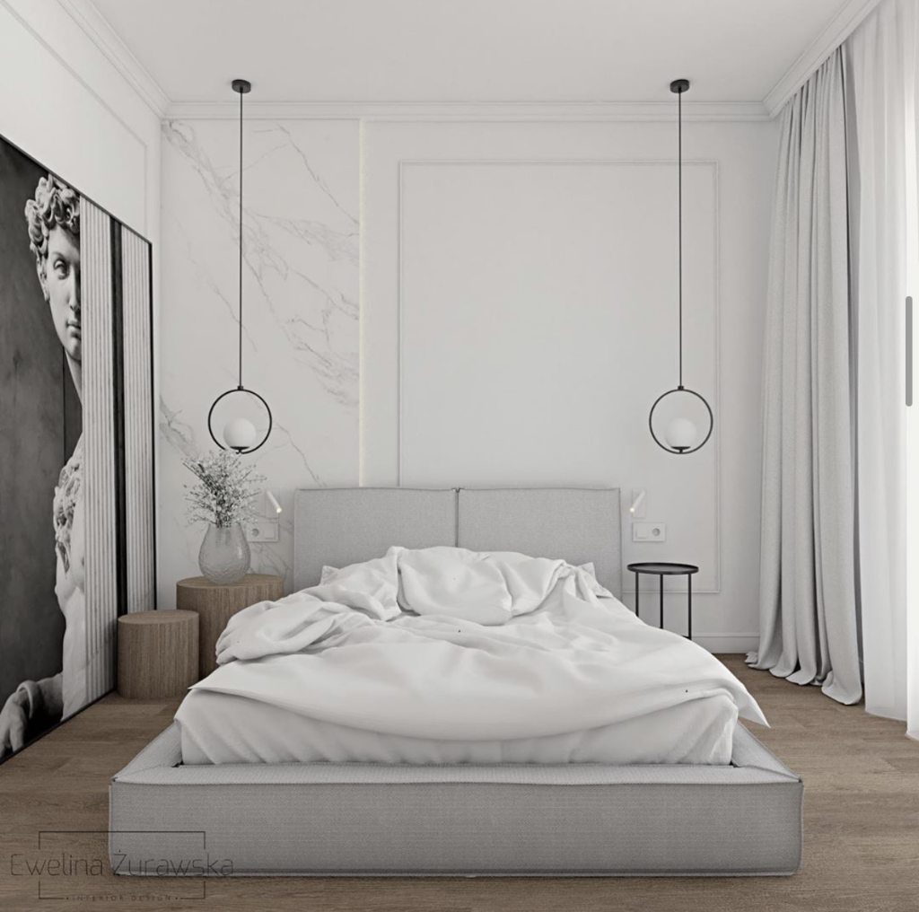 Zanim zaczniesz wybierać lampy do sypialni, zadbaj o odpowiednią bazę całej aranżacji. Co to znaczy? W małych pomieszczeniach warto pamiętać o zasadach obecnie modnego minimalizmu i postawić na jasne kolory. Nie musisz decydować się na biel, ale zwróć uwagę na beże, pastele i delikatniejsze szarości. Nie da się ukryć, że dzięki nim twoja sypialnia będzie wydawała się przestronniejsza i bardziej harmonijna. Ściany nie będą pochłaniać światła, a dodatkowo je odbiją.