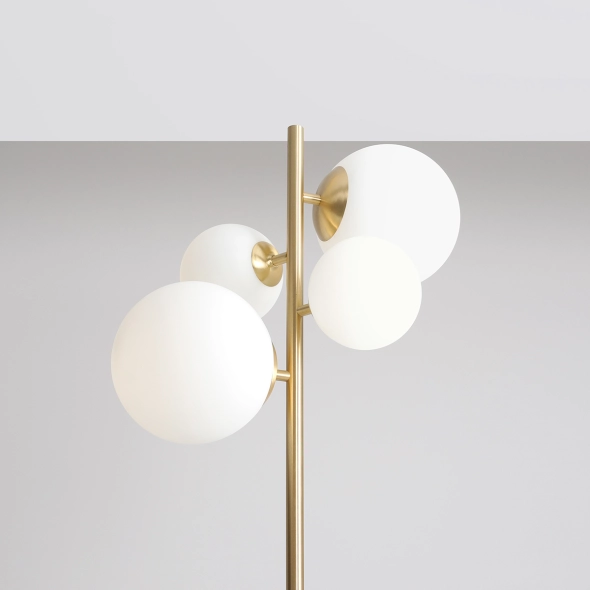 Nowoczesna lampa podłogowa z bestsellerowej kolekcji Bloom, to cztery mleczne klosze o dwóch średnicach (14 i 20cm) o matowym wykończeniu, które oplatają stelaż lampy. Lampy produkowane w Polsce z najwyższej jakości materiału- mosiądzu, poddawanego starannej obróbce- szczotkowaniu. Lampa stojąca Bloom świetnie sprawdzi się w sypialni, salonie czy gabinecie nadając wnętrzu przyjemny klimat.