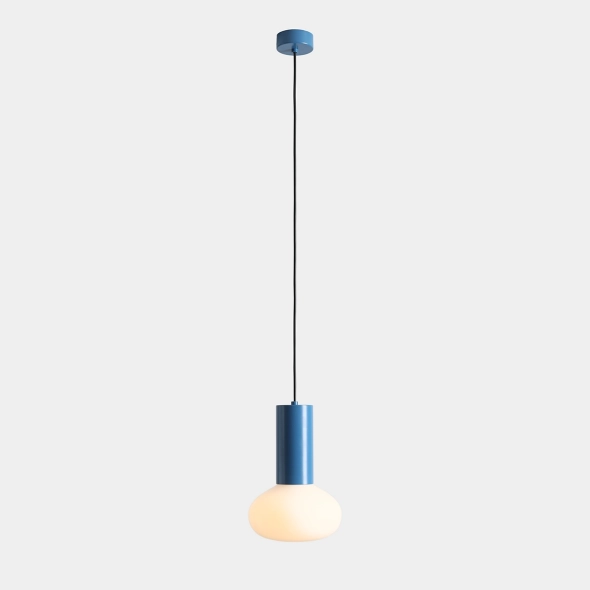 Nowoczesna lampa wisząca z białym, opalowym kloszem i niebieską oprawą, która ładnie i równomiernie rozprasza światło, tworząc przyjemną atmosferę w pomieszczeniu. Posiada regulowaną długość zawieszenia, dzięki czemu łatwo dopasować ją do różnych przestrzeni. Jest częścią kolekcji zaprojektowanej dla Artery przez Sedno Studio. Źródło światła w zestawie.