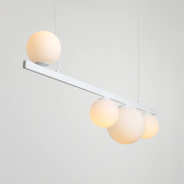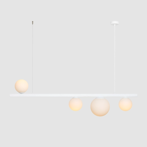 Garda 4 White to stylowa i oryginalna lampa wisząca o niebanalnym, nowoczesnym designie, która pięknie rozświetli przestrzeń nad stołem w salonie lub jadalni. Lampa posiada cztery punkty świetlne, zamknięte w mlecznych kulach o średnicy 14 i 20cm, które miękko i subtelnie rozproszą światło, tworząc w pomieszczeniu wyjątkową atmosferę.