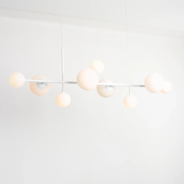 Dione 9 White to nowoczesna, rozłożysta lampa wisząca z naszej bestsellerowej serii, tworząca wyjątkową atmosferę w pomieszczeniu. Szeroka na 170cm, z regulacją wysokości, świetnie sprawdzi się jako rozwiązanie nad duży, gościnny stół w salonie czy jadalni. Lampa posiada cztery matowe klosze o średnicy 20cm, wychodzące z boków oprawy oraz pięć mniejszych - 14cm, które sprawiają, że wydobywające się z niej światło pięknie rozprasza się we wnętrzu i nie jest spłaszczone.