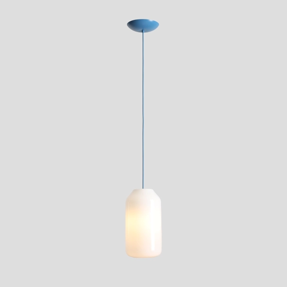 FLASK SAPPHIRE M (proj. Mikołaj Nicer / Nicer Design) to smukła lampa wisząca z opalowego szkła, która łączy miękkie światło z chłodniejszym, eleganckim akcentem błękitu. Mlecznobiały klosz o gładkiej powierzchni rozprasza światło bez olśnienia, a po włączeniu delikatnie ociepla ton szkła. Błękitny kabel i podsufitka w odcieniu RAL 5007 wprowadzają spokojny detal, pasujący do wnętrz nowoczesnych, jasnych i minimalistycznych. Rozmiar M ma Ø19 cm i 39 cm wysokości, więc jest wyraźnie smukły i lekki wizualnie - idealny do zawieszania w szeregu nad wyspą lub w kompozycji nad stołem. Kabel ma regulowaną długość. Lampa wyposażona jest w wymienne źródło światła E27, które znajduje się w zestawie.